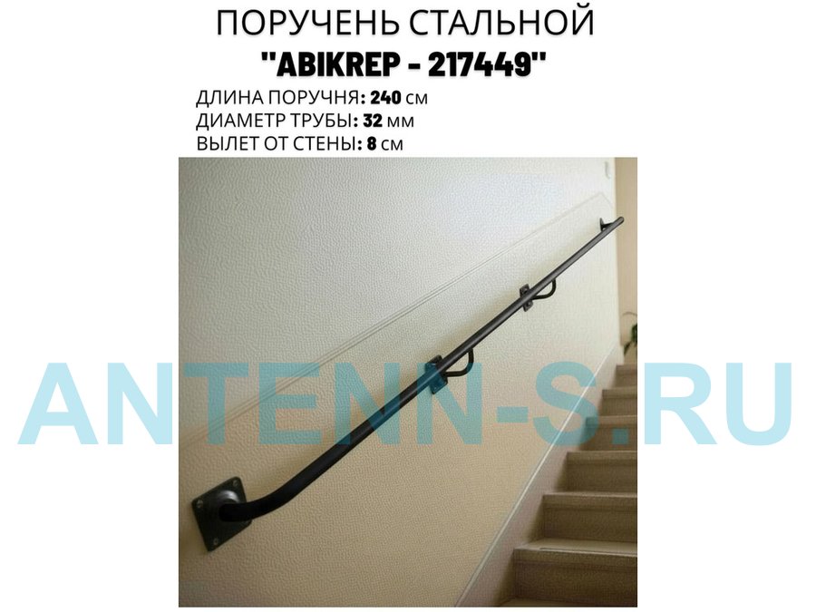 Поручень пристенный для зданий, длина 240см вылет 8см "ABIKREP-217449" черный, 4 опоры, диаметр 32мм