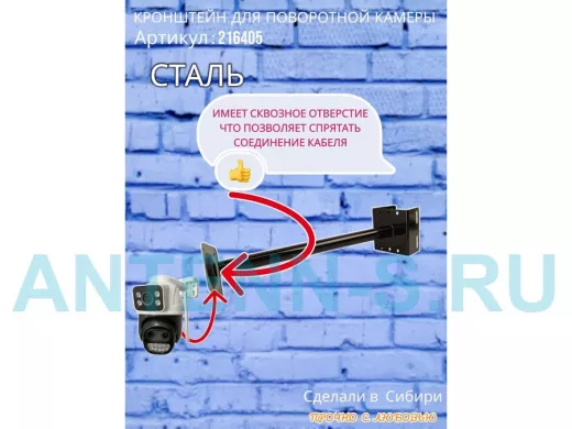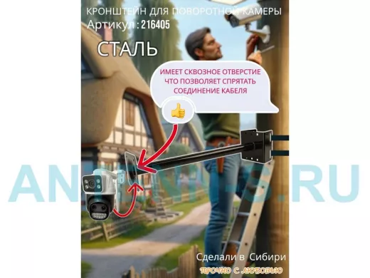 - Кронштейн для крепления видеокамеры на столб имеет сквозное отверстие, что позволяет спрятать соединения кабеля, тем самым защищает их от внешних воздействий (дождь, снег, ветер) поэтому нет необходимости использовать дополнительный гермобокс, т.к. разъемы спрячутся в трубе.
