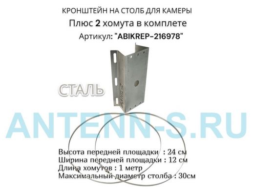 Кронштейн оцинкованный для камеры видеонаблюдения с двумя хомутами на столб "ABIKREP-216978" 24х12см