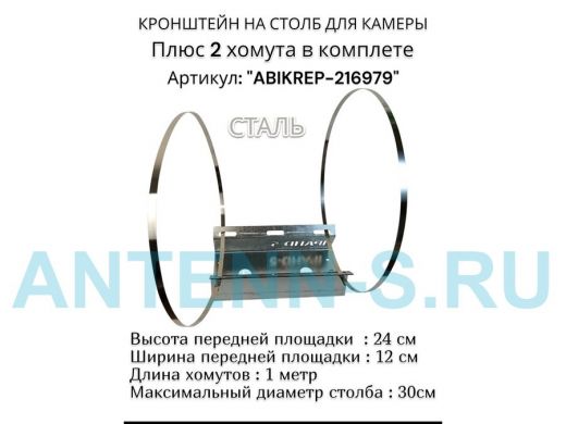Кронштейн оцинкованный для камеры видеонаблюдения с хомутами на столб "ABIKREP-216979" 24х12см, 2отв