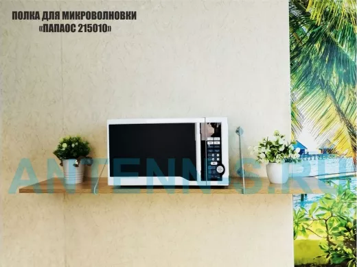 - Полка надежно крепится к стене при помощи анкеров или шурупов с дюбелями, на ней можно разместить микроволновую печь, кухонную технику, посуду, специи
