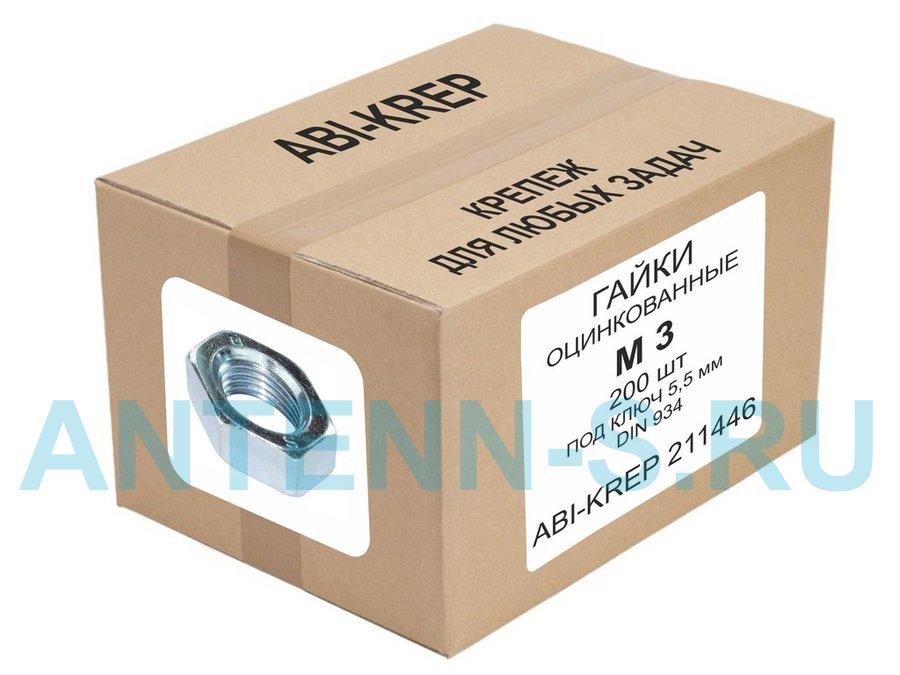 В корзину Купить в 1 клик Гайки оцинкованные М3 DIN 934 (1) шт) "ABI-KREP 211060" под ключ 5,5мм, вес 1шт 0,34г