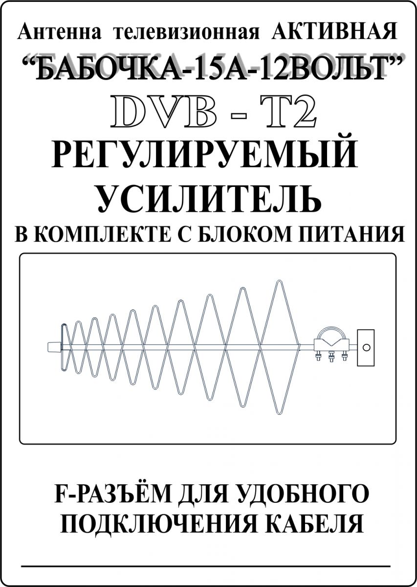 - "БАБОЧКА-15А-12ВОЛЬТ" РЕГУЛИРУЕМАЯ АКТИВНАЯ СЕРЕБРИСТАЯ уличная телевизионная антенна предназначена для приема цифрового DVB-T2 и аналогового телевизионного сигнала ДМВ диапазона