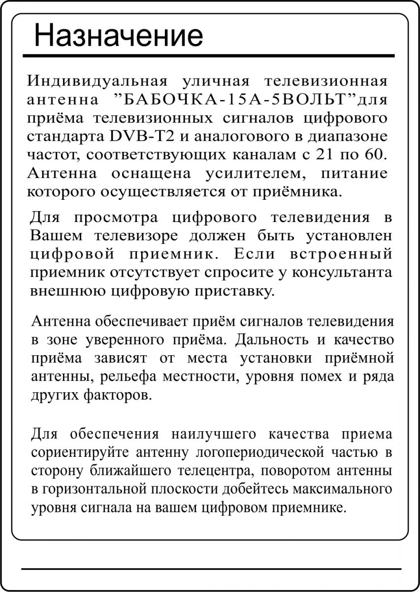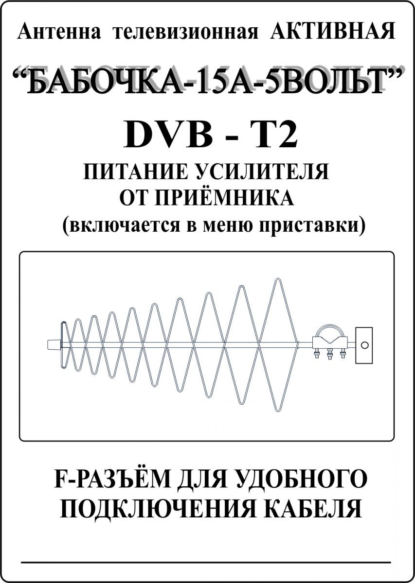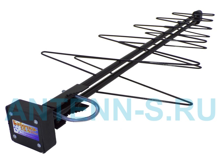 - "БАБОЧКА-15А-5ВОЛЬТ" РЕГУЛИРУЕМАЯ АКТИВНАЯ ЧЁРНАЯ уличная телевизионная антенна предназначена для приема цифрового DVB-T2 и аналогового телевизионного сигнала ДМВ диапазона