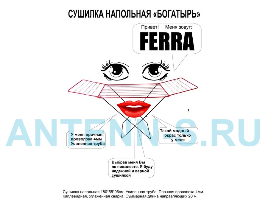- "БОГАТЫРЬ" FERRA сушилка напольная КРАСНО-ЧЁРНАЯ 20 метров, предназначена для сушки белья