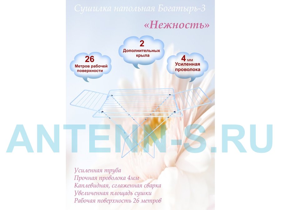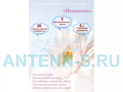 - "БОГАТЫРЬ-3" НЕЖНОСТЬ сушилка напольная БЕЛАЯ 26 метров, предназначена для сушки белья