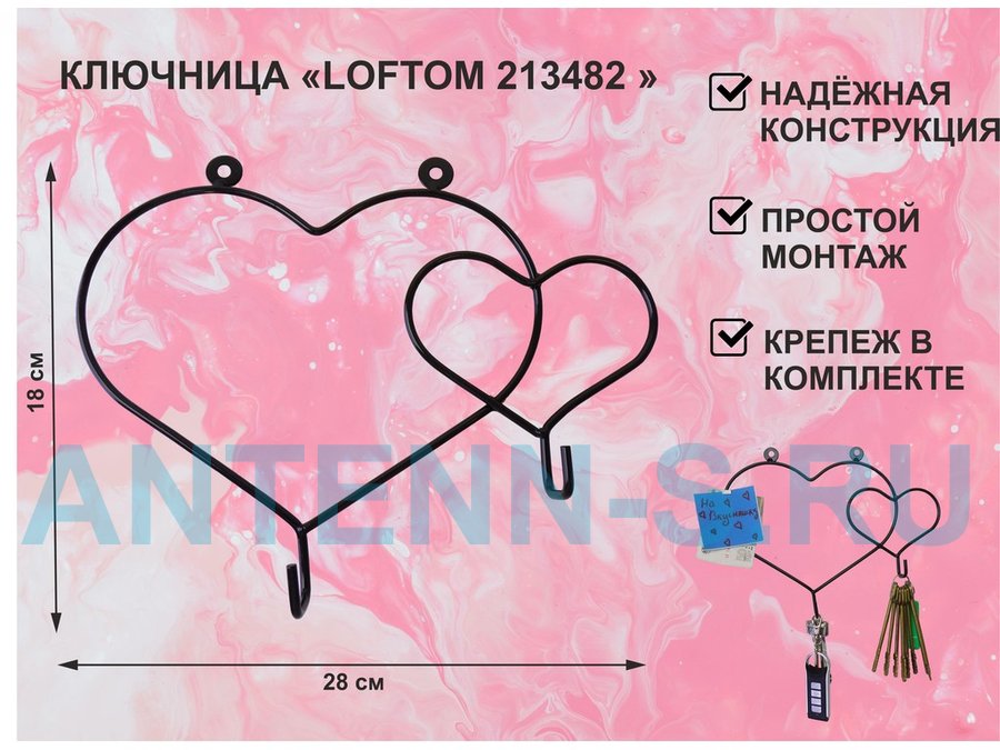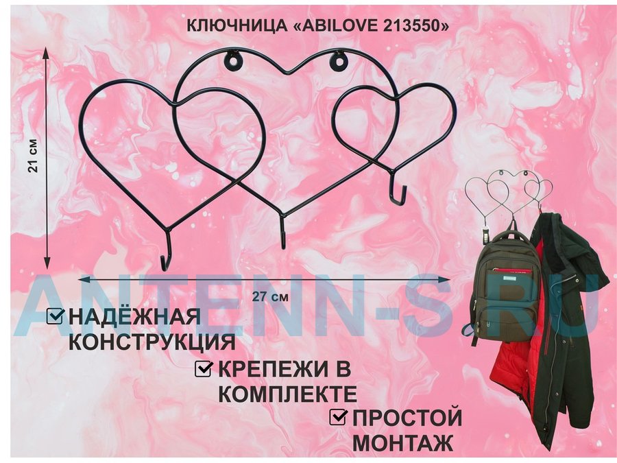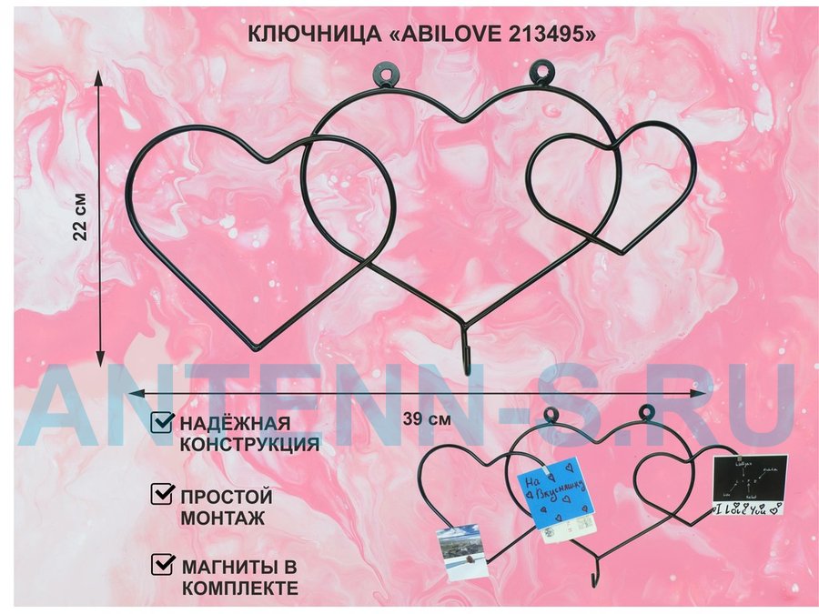 Ключница с крючком и 3 магнитами для записок и фотографий, 3 сердца,вешалка, чёрный "ABILOVE 213495"