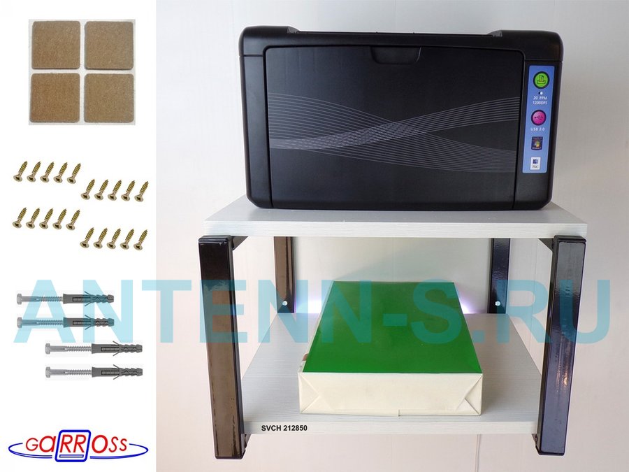 - Полка надежно крепится к стене при помощи анкеров или шурупов с дюбелями, на ней можно разместить принтер, сканер, МФУ и другую офисную технику