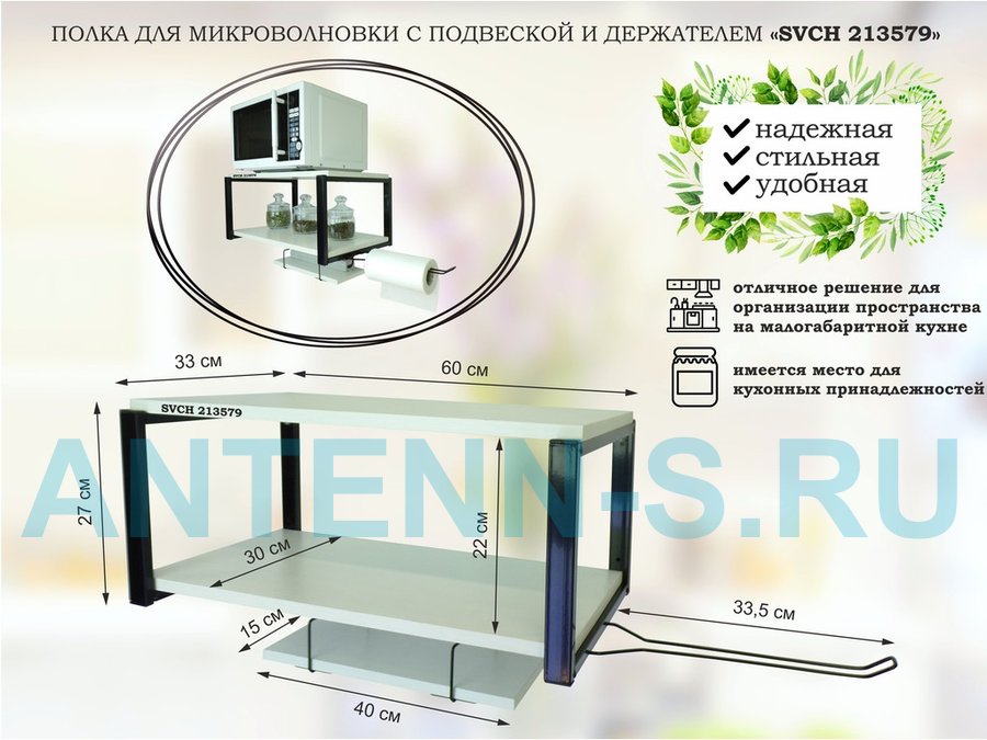 В корзину Купить в 1 клик Полка для микроволновки 60х30см с подвеской 40х15см, 27см, черный "SVCH 213579",сосна, с держателем