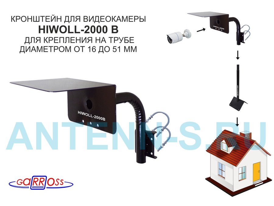 В корзину Купить в 1 клик Кронштейн "HIWOLL-2000B-121405" чёрный с хомутами и козырьком на мачту для видеокамеры и прожектора