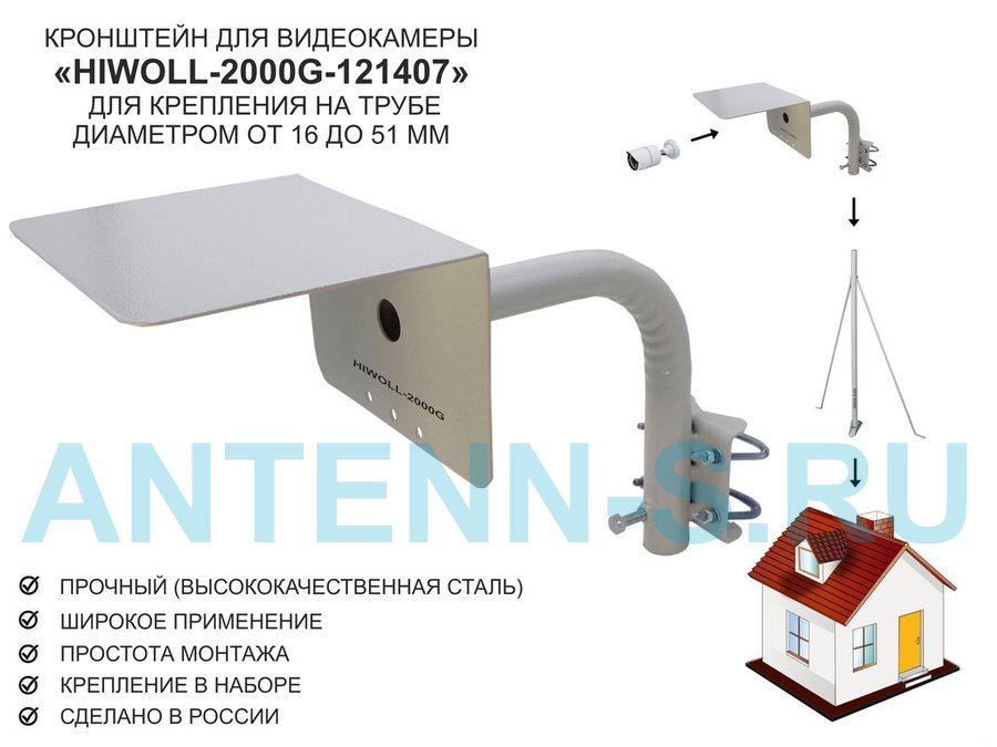 В корзину Купить в 1 клик Кронштейн "HIWOLL-2000G-121407" серый с хомутами и козырьком на мачту для видеокамеры и прожектора
