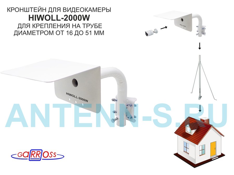 В корзину Купить в 1 клик Кронштейн "HIWOLL-2000W-199090" белый с хомутами и козырьком на мачту для видеокамеры и прожектора