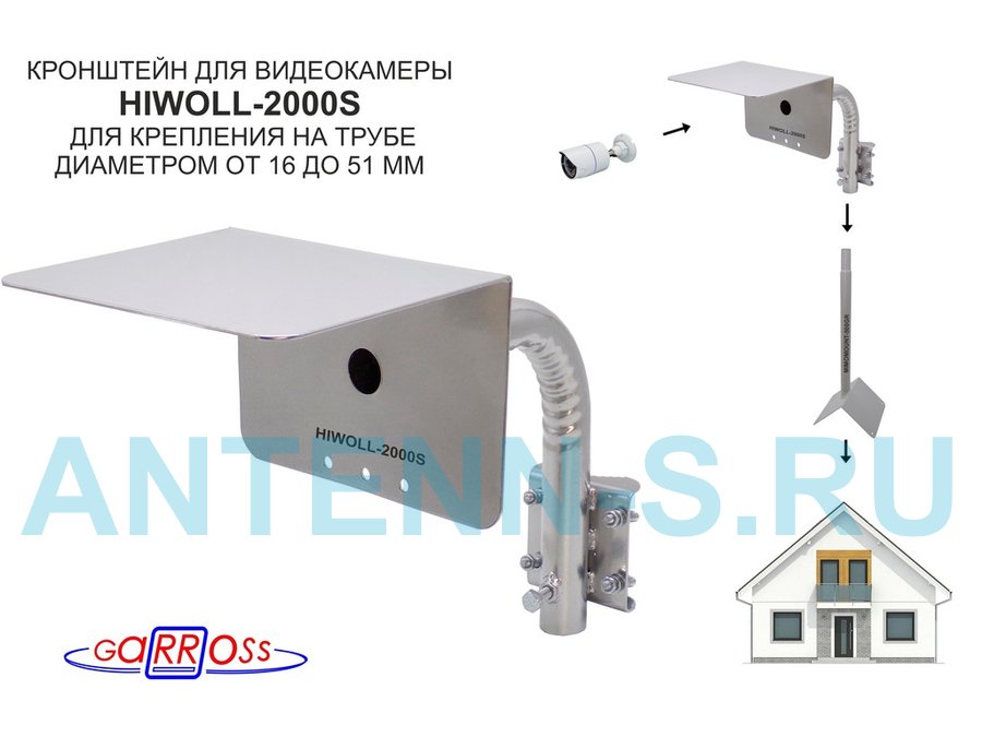 В корзину Купить в 1 клик Кронштейн "HIWOLL-2000S-201358" серебристый с хомутами и козырьком на мачту для камеры и прожектора