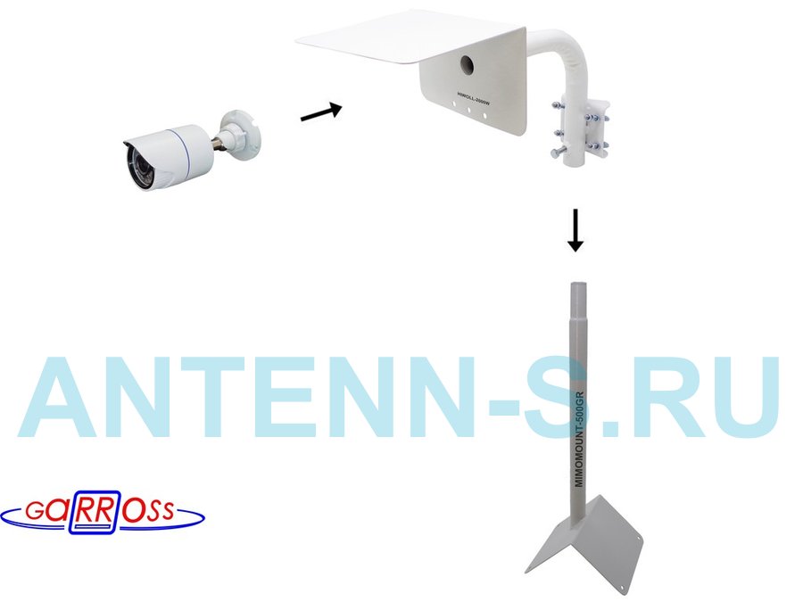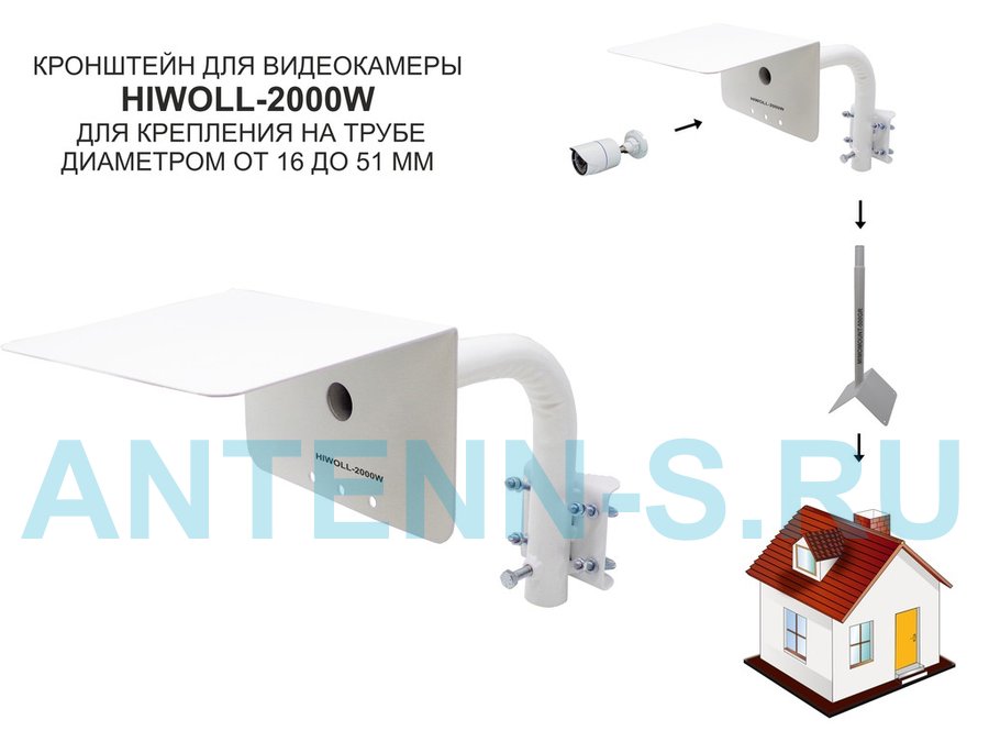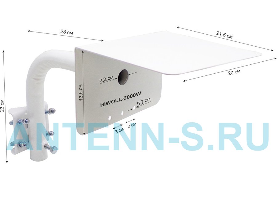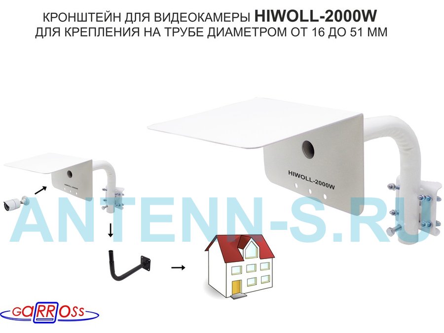 Кронштейн "HIWOLL-2000W-199090" белый с хомутами и козырьком на мачту для видеокамеры и прожектора