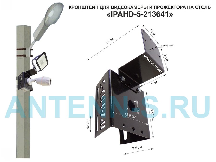 В корзину Купить в 1 клик Кронштейн для камеры и прожектора на столб "IPAHD-5-213641" черный под СИП-ленту, хомут, вылет 75мм