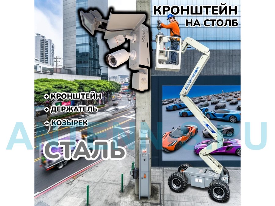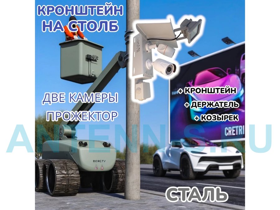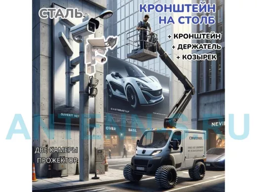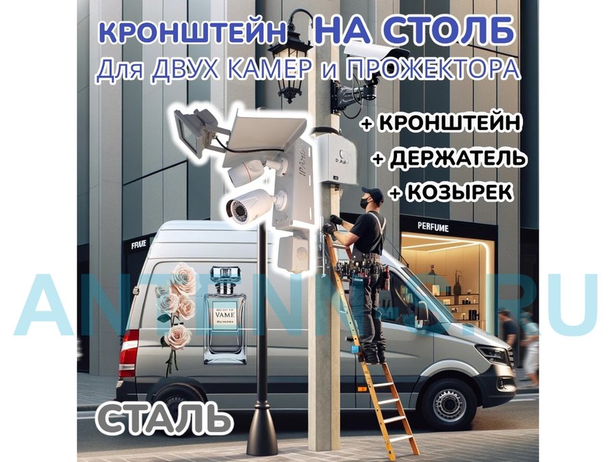 Кронштейн с козырьком и площадкой под монтажную коробку для крепления двух камер и прожектора на столб при помощи ленты или хомутов