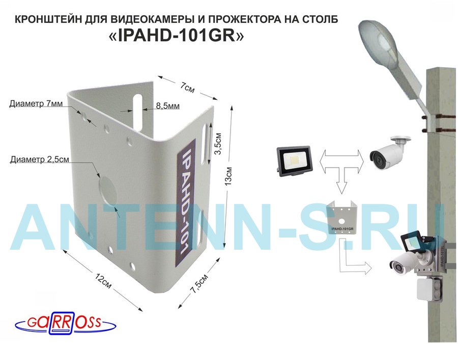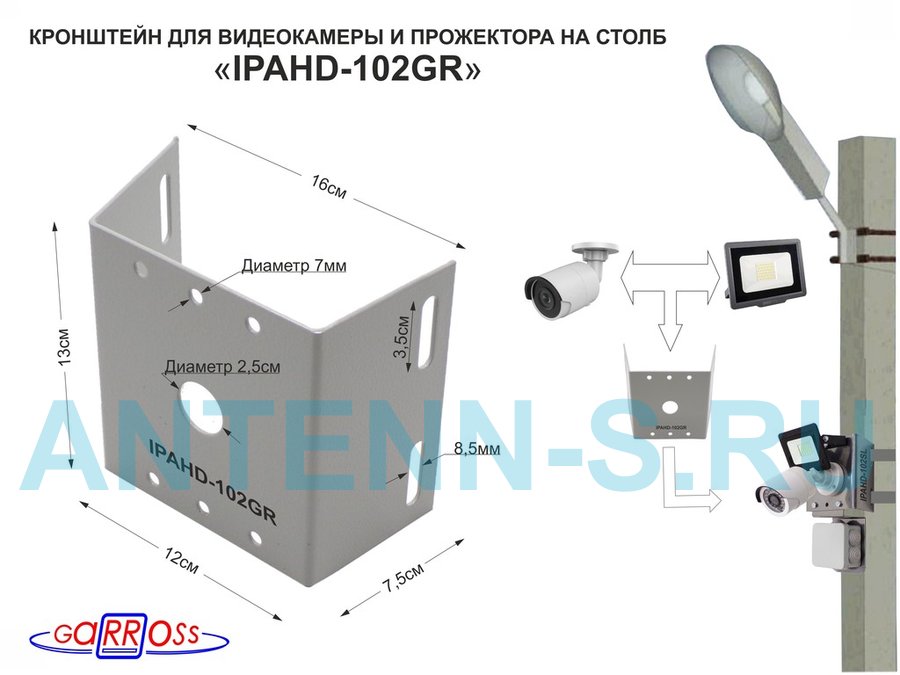 Кронштейн для 1 камеры и прожектора на столб, прочная сталь 2мм серый "IPAHD-101GR-122418" под ленту