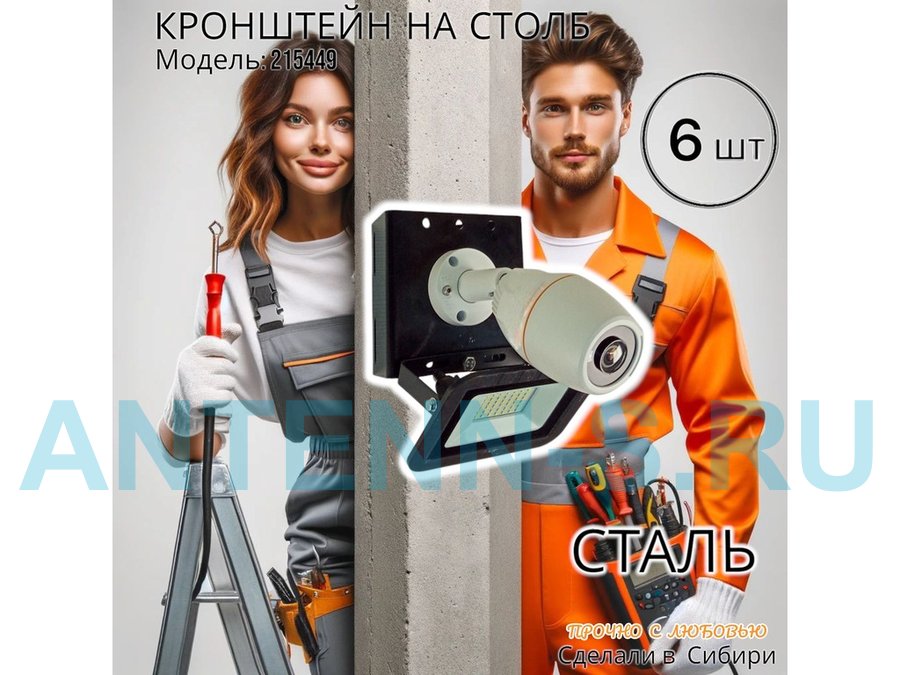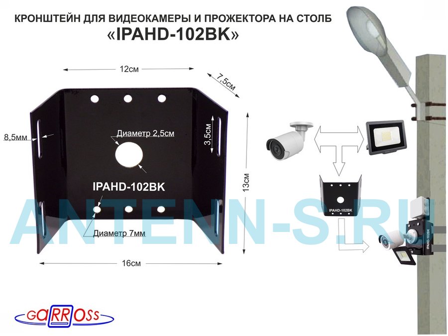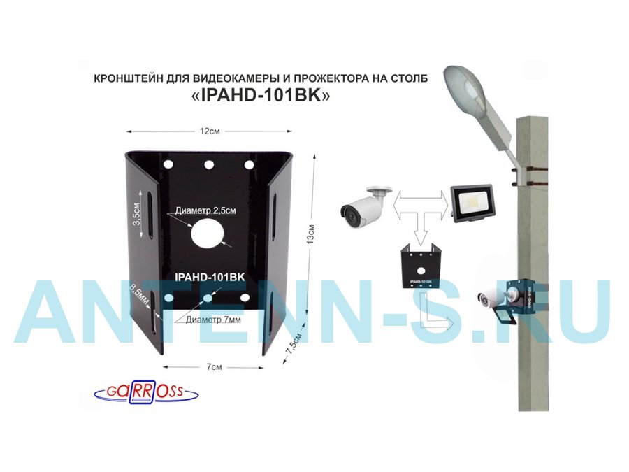 Кронштейн для 1 камеры и прожектора на столб, прочная сталь 2мм черный "IPAHD-101BK-89766" под ленту