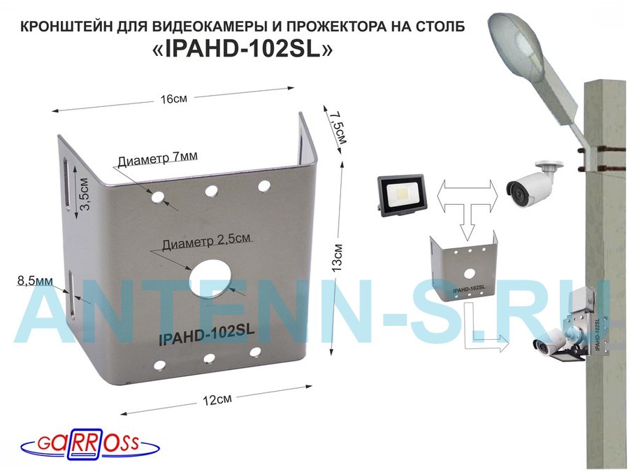 Кронштейн "IPAHD-203083" СЕРЫЙ кронштейн с прожектором для камеры на столб под СИП, вылет 80мм, 75мм