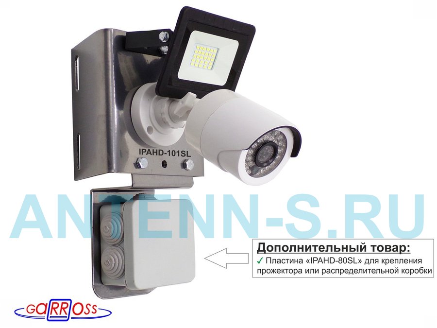 - Конструкция кронштейна позволяет крепить дополнительную опцию в виде разводной коробки, для укладки соединительных электропроводов от камеры и прожектора.