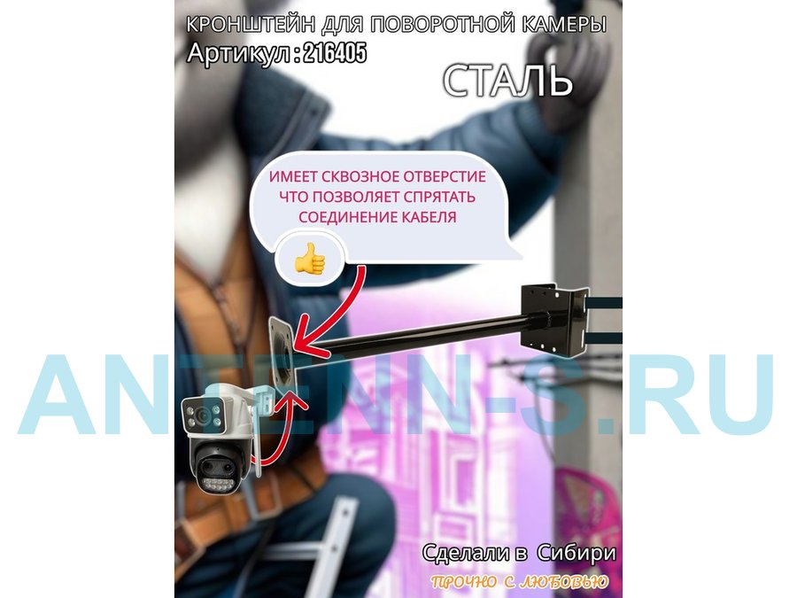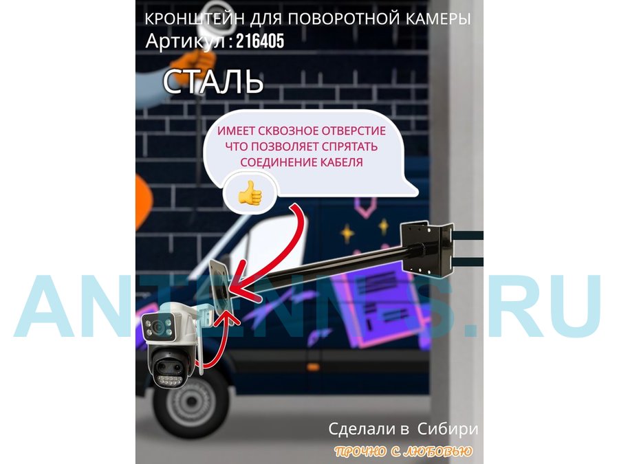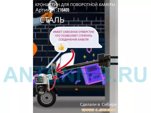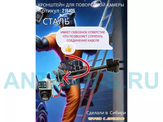 - Кронштейн для крепления видеокамеры на столб имеет сквозное отверстие, что позволяет спрятать соединения кабеля, тем самым защищает их от внешних воздействий (дождь, снег, ветер) поэтому нет необходимости использовать дополнительный гермобокс, т.к. разъемы спрячутся в трубе.