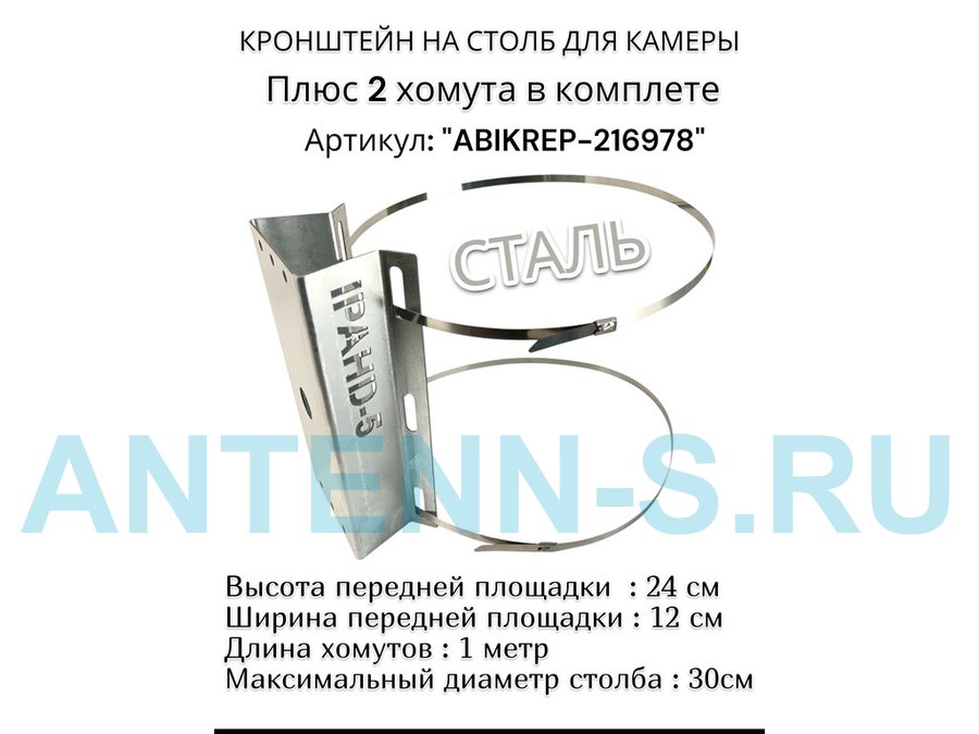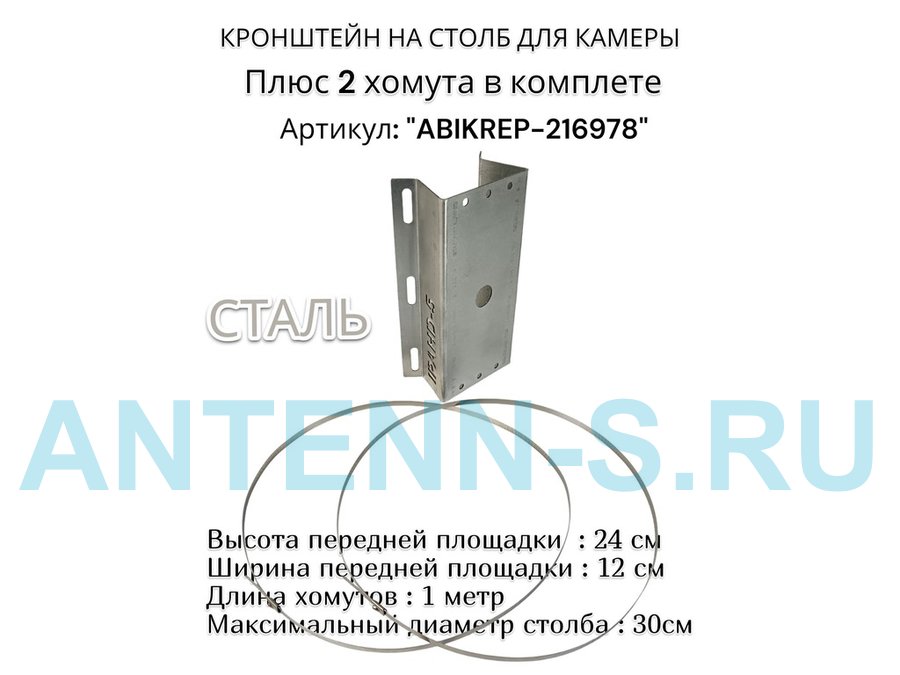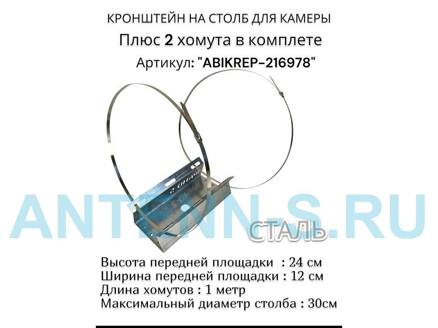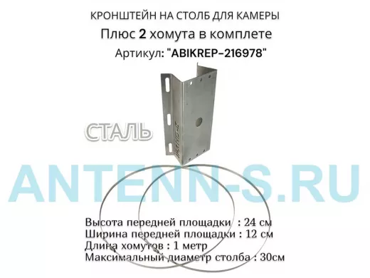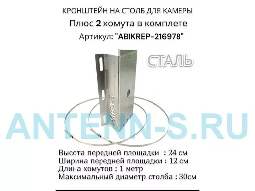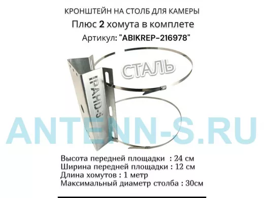 Кронштейн оцинкованный для камеры видеонаблюдения с двумя хомутами на столб "ABIKREP-216978" 24х12см