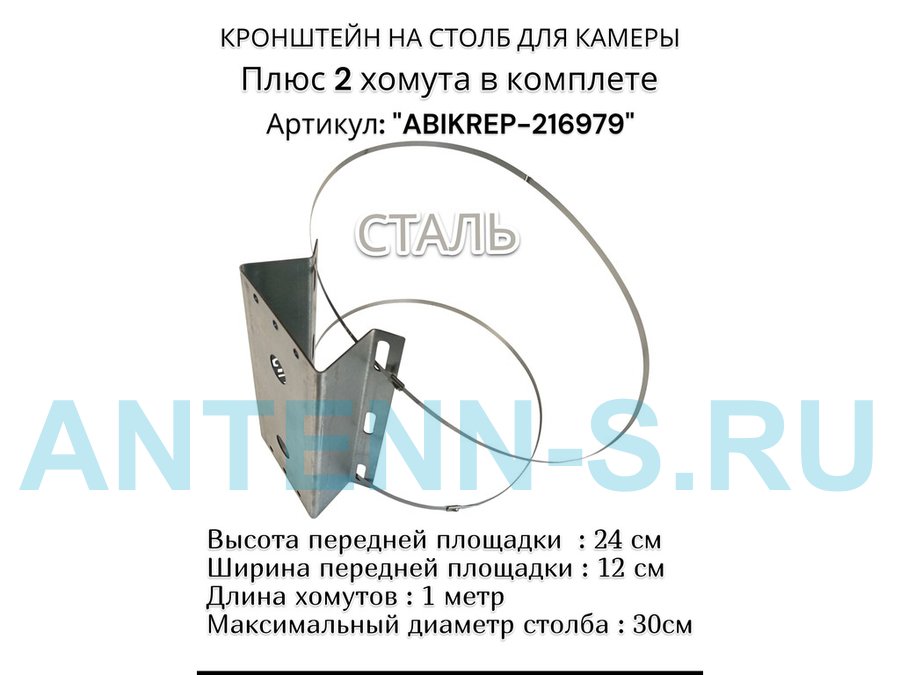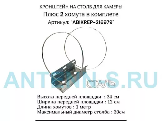 Кронштейн оцинкованный для камеры видеонаблюдения с хомутами на столб "ABIKREP-216979" 24х12см, 2отв