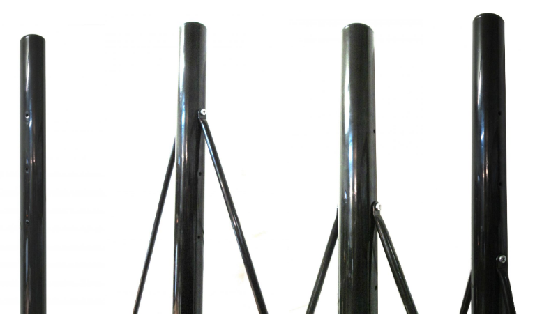 На трубе диаметром 50мм имеются три отверстия, что позволяет регулировать высоту установки труб-растяжек при монтаже