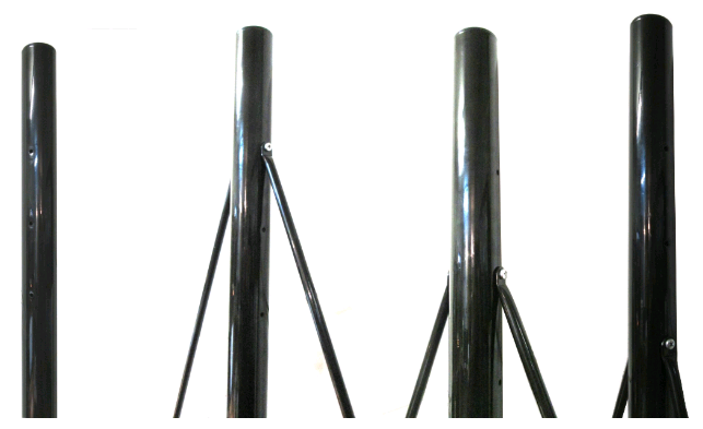 - На вертикальной трубе имеются три отверстия, что позволяет предварительно пошагово регулировать высоту установки труб-растяжек при закреплении мачты на крыше с разной степенью наклона. Мачту можно выставить вертикально практичеки на любой наклонной кровле путём регулировки места крепления к кровле труб-растяжек.