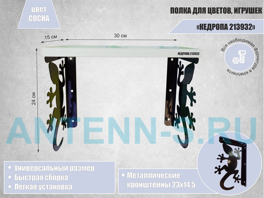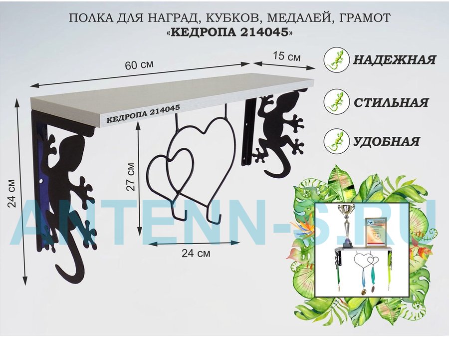 Полка для наград, кубков, медалей, грамот "КЕДРОПА-214045 гекон" размер 15х60х24 см, сосна с сердцем