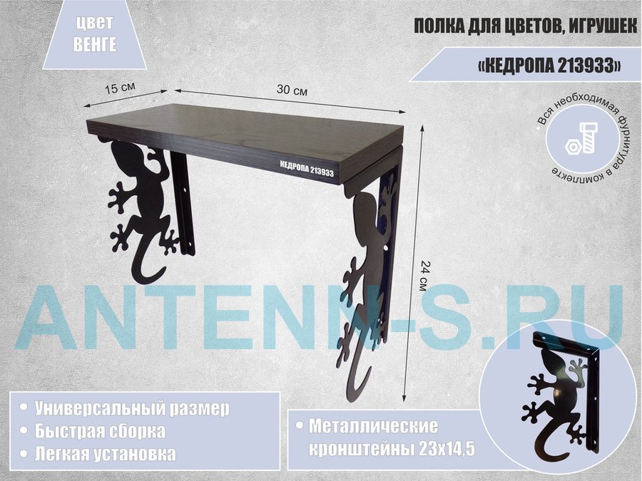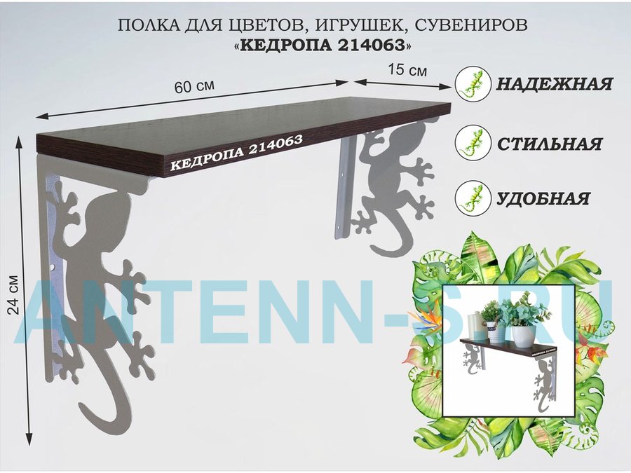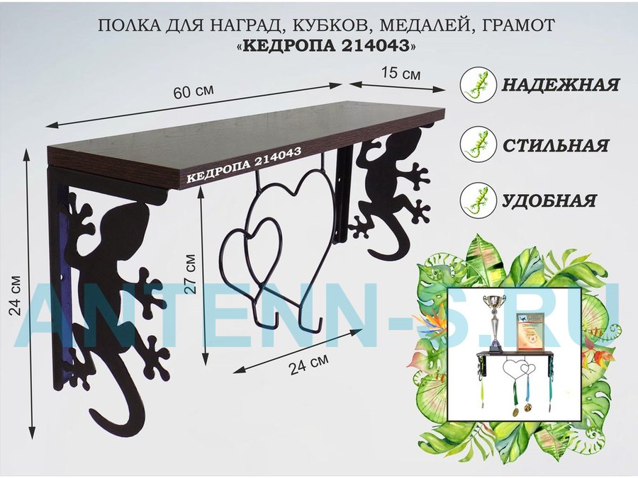 Полка для наград, кубков, медалей, грамот "КЕДРОПА-214043 гекон" размер 15х60х24 см, венге с сердцем