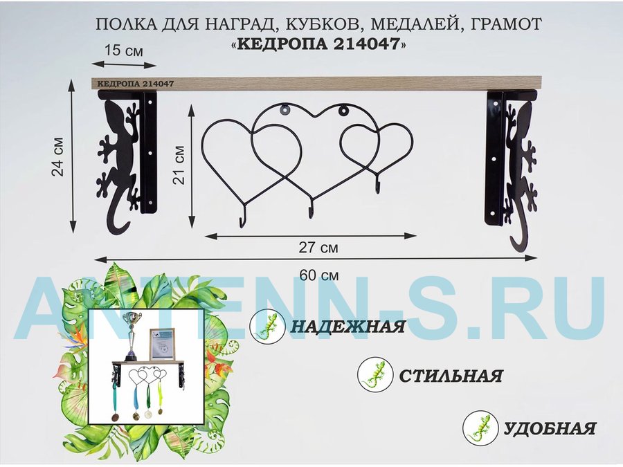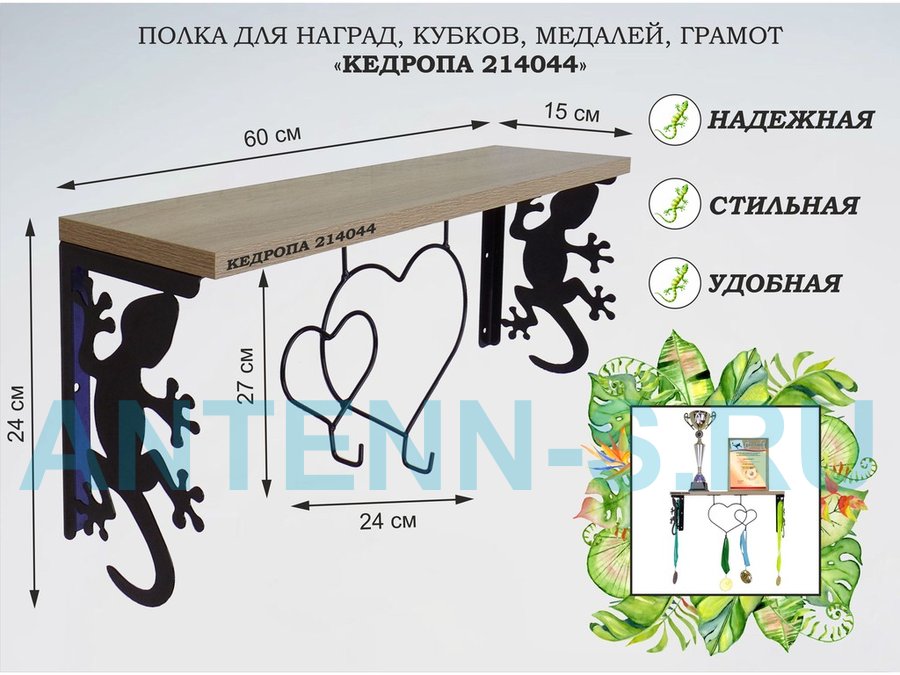 Полка для наград, кубков, медалей, грамот "КЕДРОПА-214046 гекон"размер 15х60х24 см, сосна с сердцами
