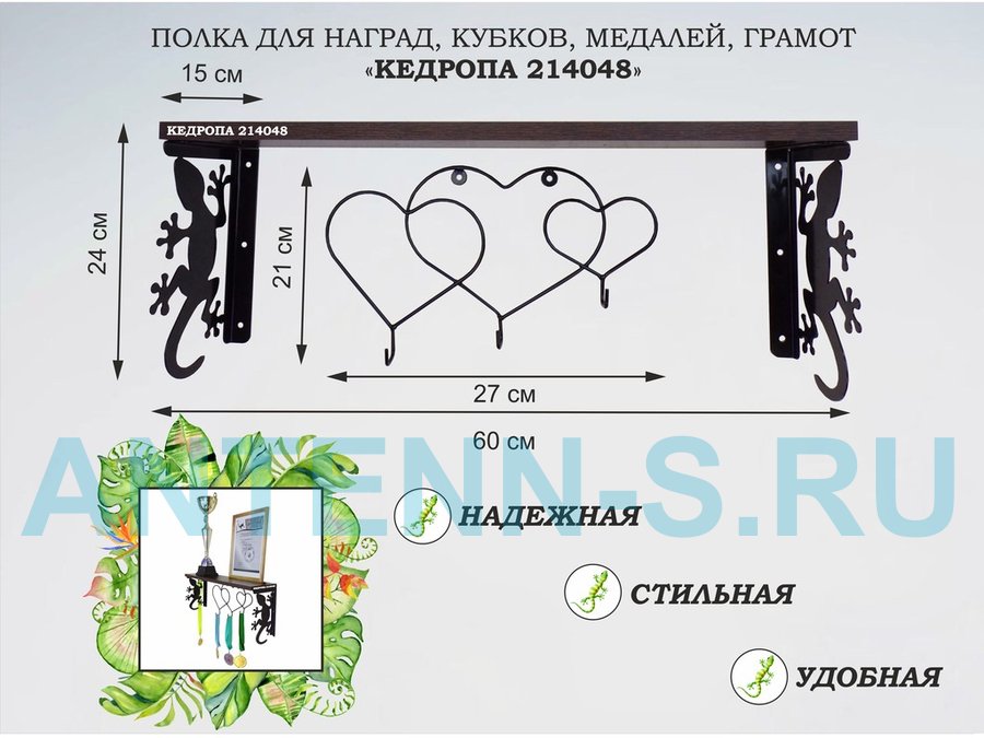 Полка для наград, кубков, медалей, грамот "КЕДРОПА-214048 гекон"размер 15х60х24 см, венге с сердцами