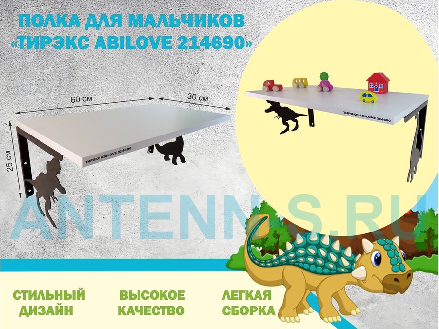 В корзину Купить в 1 клик Полка с динозаврами "ТИРЭКС ABILOVE-214690" для конструкторов, машинок, белый, 30х60см