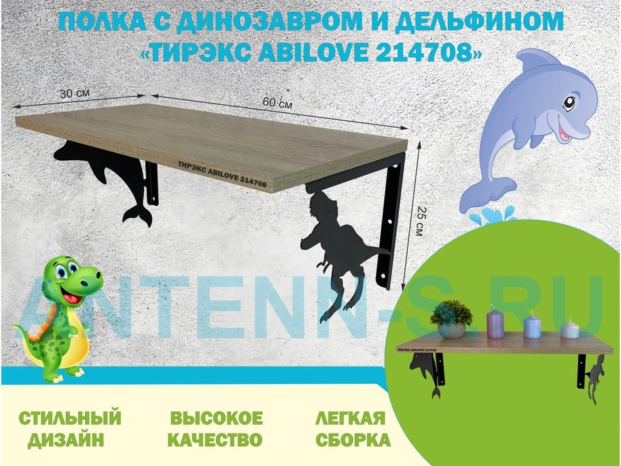 В корзину Купить в 1 клик Полка с динозавром и дельфином "ТИРЭКС ABILOVE-214708" для игрушек, дуб сонома, 30х60см