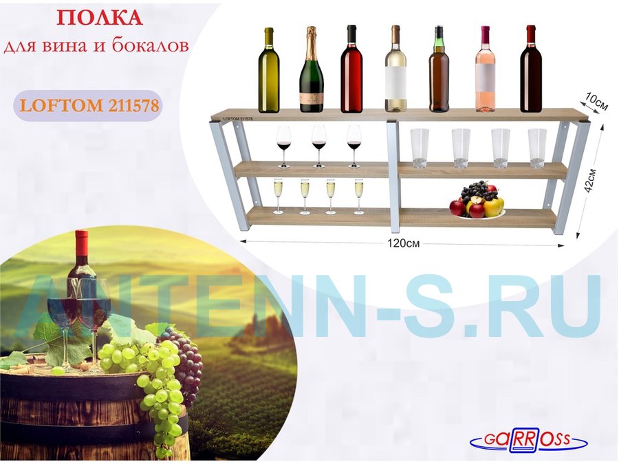 В корзину Купить в 1 клик Полка для вина и бокалов, высота 42см, 3 уровня, размер 10х120см, серая "LOFTOM 211578" дуб сонома