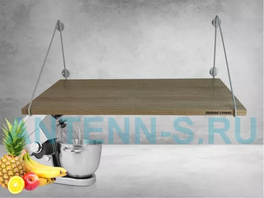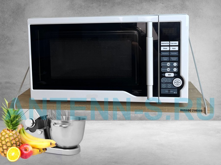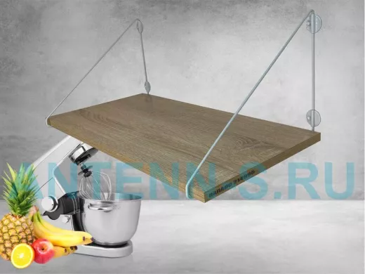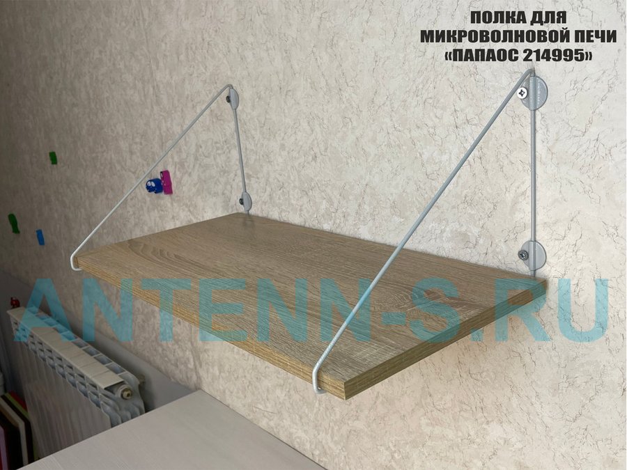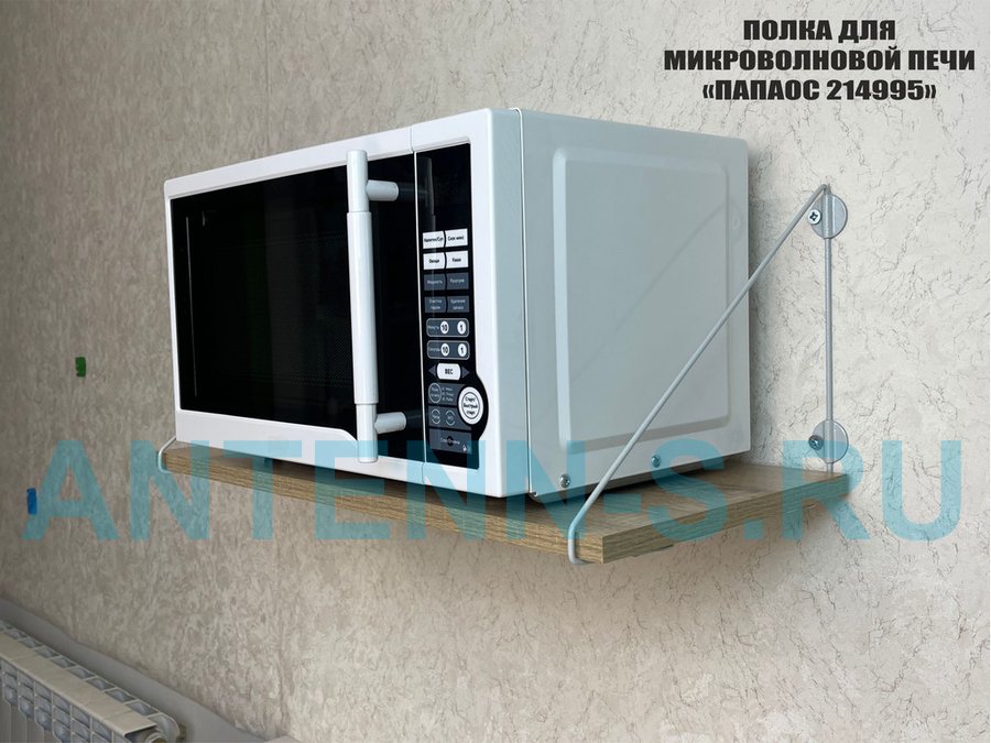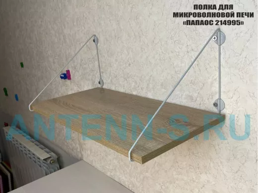- Полка надежно крепится к стене при помощи анкеров или шурупов с дюбелями, на ней можно разместить микроволновую печь, кухонную технику, посуду, специи и многое другое