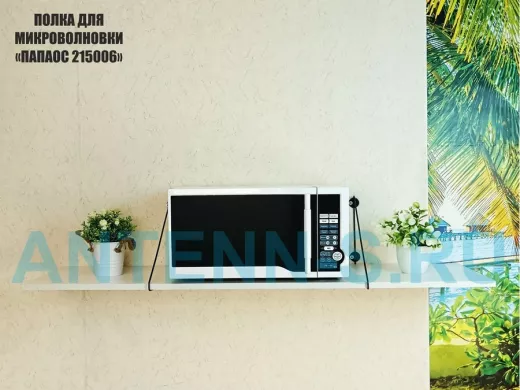 - Полка надежно крепится к стене при помощи анкеров или шурупов с дюбелями, на ней можно разместить микроволновую печь, кухонную технику, посуду, специи