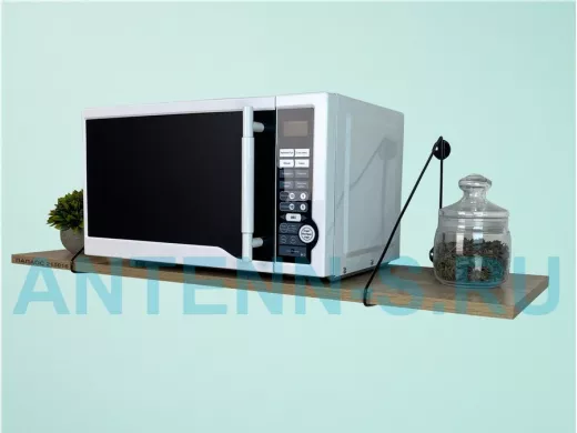- Полка надежно крепится к стене при помощи анкеров или шурупов с дюбелями, на ней можно разместить микроволновую печь, кухонную технику, посуду, специи