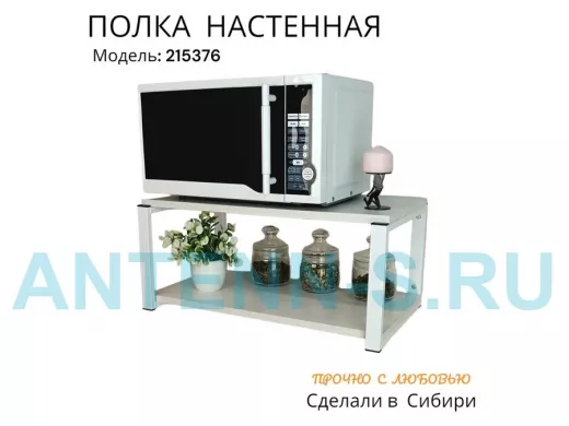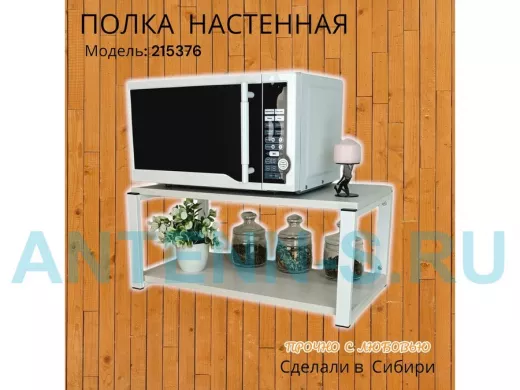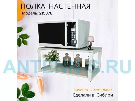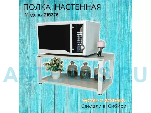 Полка надежно крепится к стене при помощи анкеров или шурупов с дюбелями, на ней можно разместить микроволновую печь, кухонную технику, посуду, специи