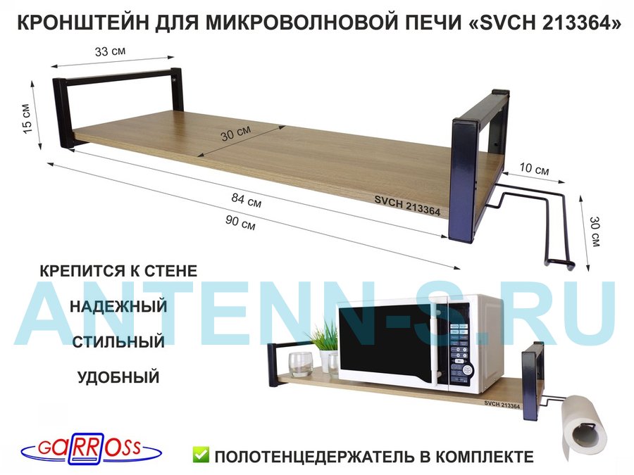 Кронштейн для микроволновой печи, 15см чёрный "SVCH 213362" полка 90х30,сосна с держателем полотенец
