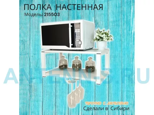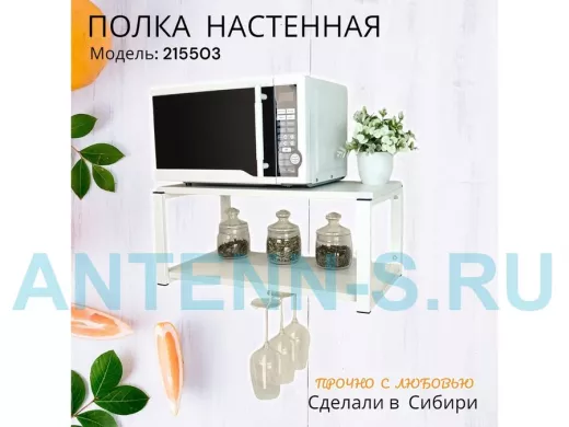 - Полка надежно крепится к стене при помощи анкеров или шурупов с дюбелями, на ней можно разместить микроволновую печь, кухонную технику, посуду, специи