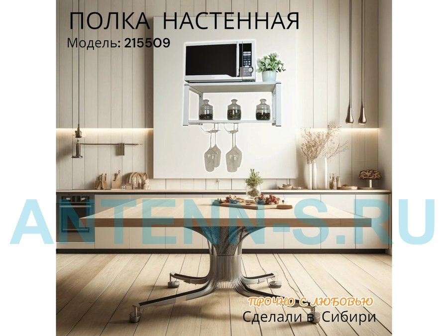 - Полка надежно крепится к стене при помощи анкеров или шурупов с дюбелями, на ней можно разместить микроволновую печь, кухонную технику, посуду, специи