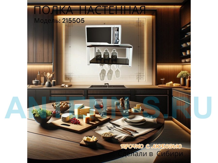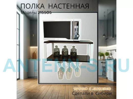 - Полка надежно крепится к стене при помощи анкеров или шурупов с дюбелями, на ней можно разместить микроволновую печь, кухонную технику, посуду, специи