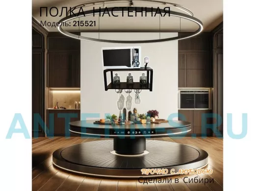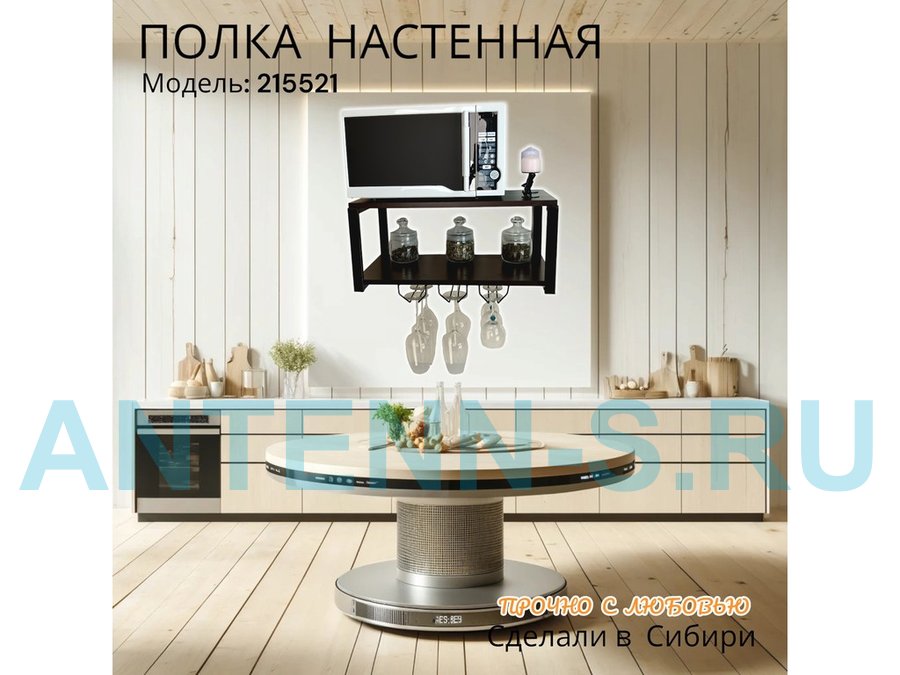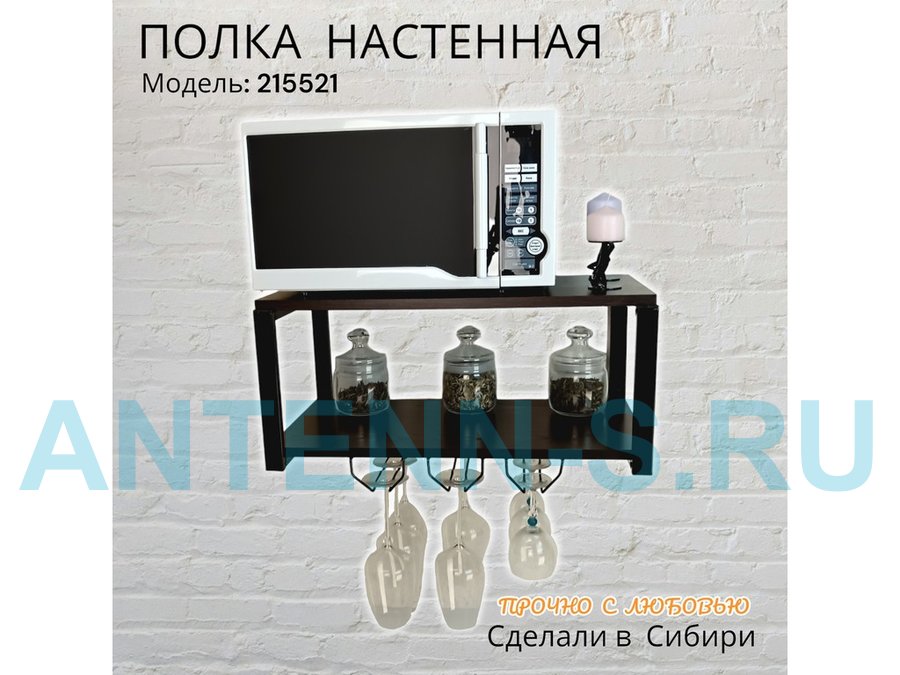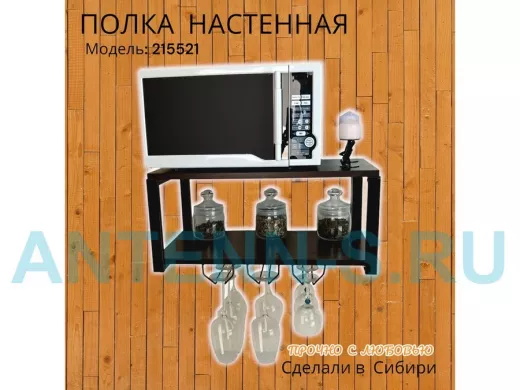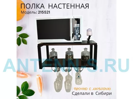 Полка надежно крепится к стене при помощи анкеров или шурупов с дюбелями, на ней можно разместить микроволновую печь, кухонную технику, посуду, специи