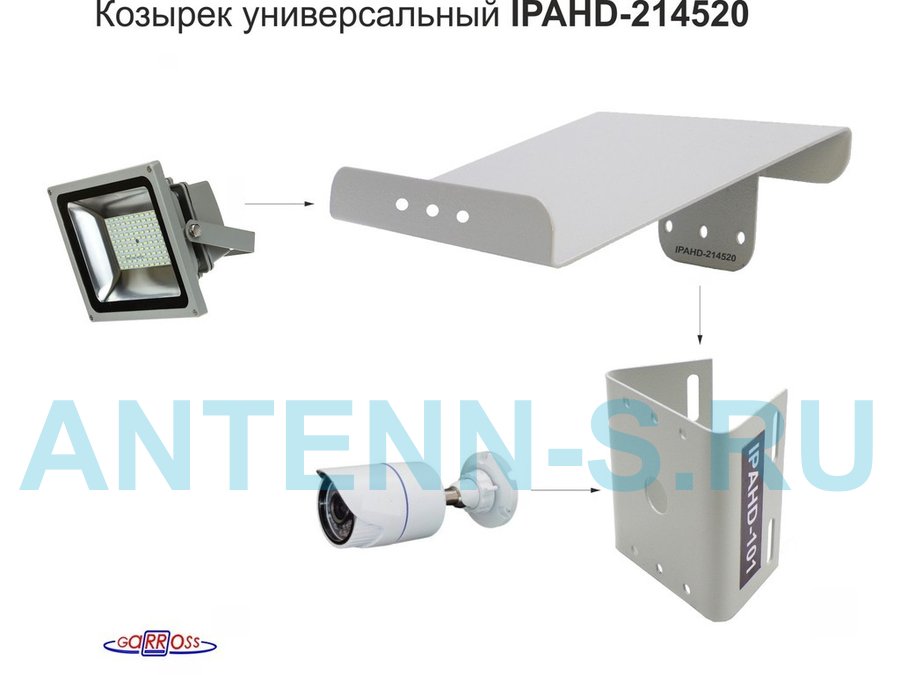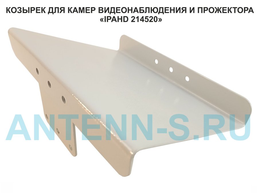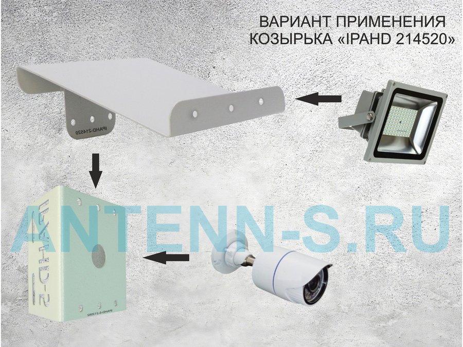 Кронштейн-козырек крепится на стену и кронштейны на столб серии IPAHD для видеокамер, оснащенные тремя отверстиями для креления опций. На козырьке спереди есть три отверстия для крепления прожектора