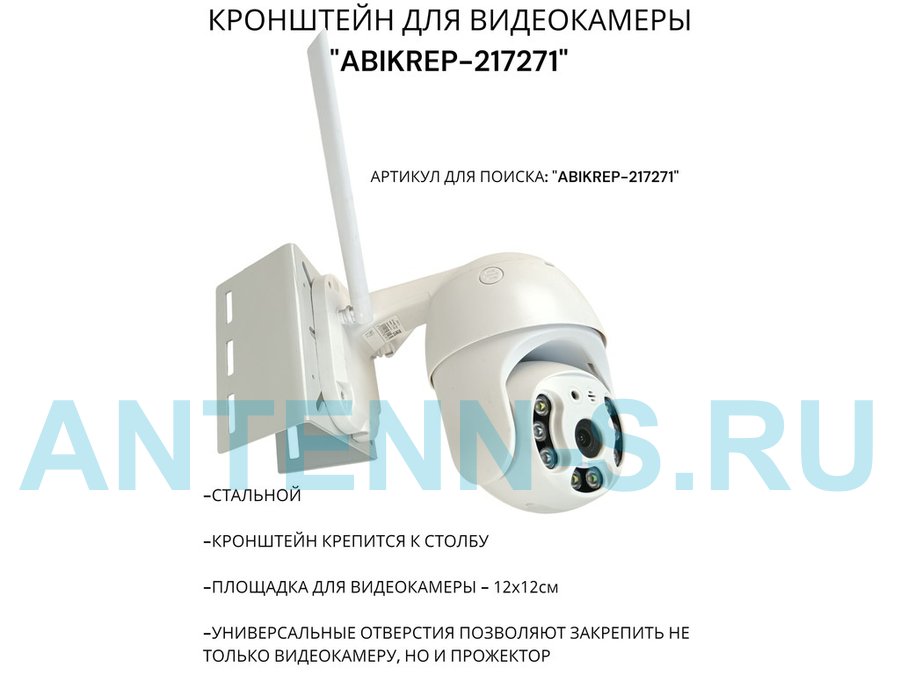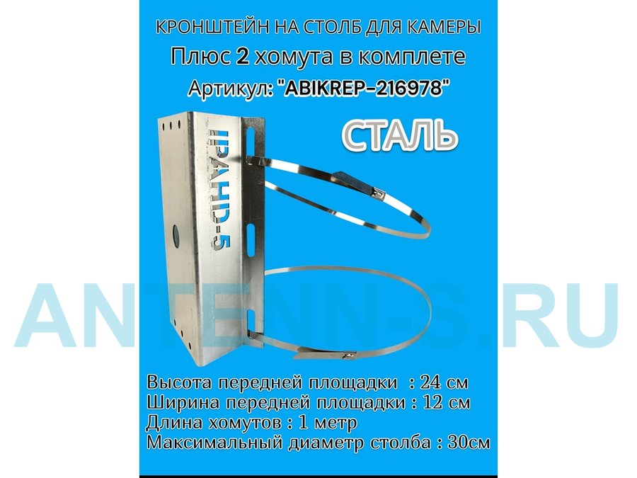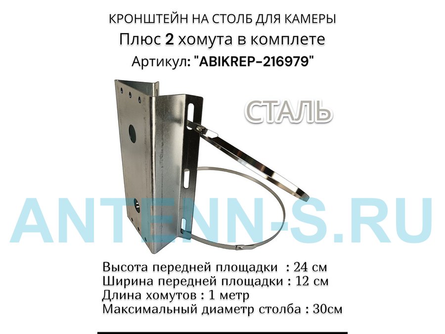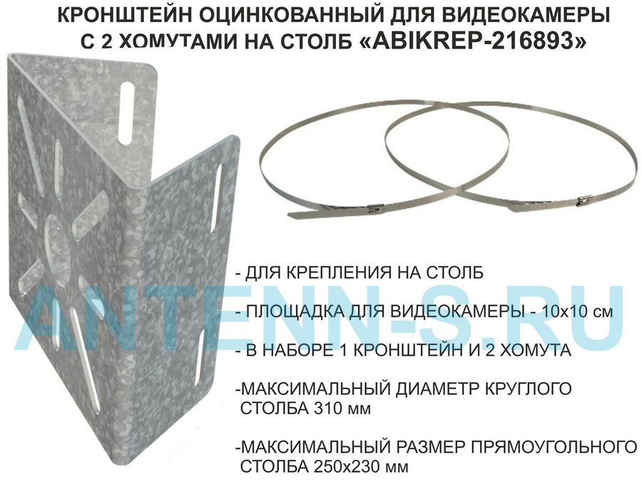 Кронштейн оцинкованный для камеры видеонаблюдения с хомутами на столб "ABIKREP-216979" 24х12см, 2отв